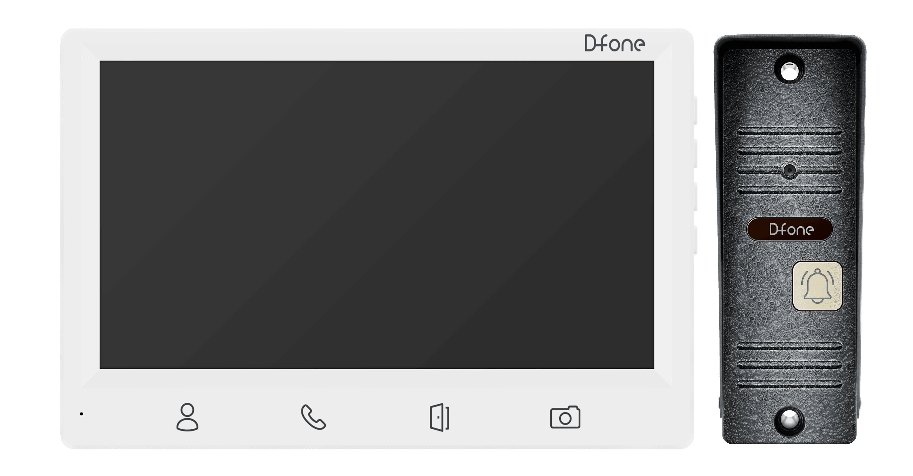 Комплект видеодомофона: монитор с 7-дюймовым экраном, сенсорными кнопками, функцией фотопамяти, а также детекцией движения, а также антивандальная вызывная панель с углом обзора 100°.